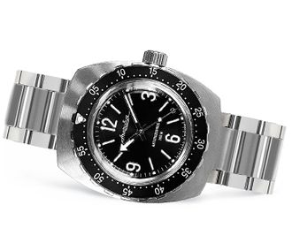 Механические часы с автоподзаводом, противоударные, водонепроницаемые (глубина погружения до 200м) со светонакопительными (светящимися)! цифрами, индексами и стрелками. Корпус часов изготовлен из высококачественной стали. Органическое стекло предназначено для глубоководных погружений и может выдержать сильное механическое давление.