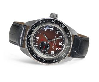 Наручные часы Восток-Командирские с автоподзаводом арт. 02017A GMT "второе время" на кожаном ремешке